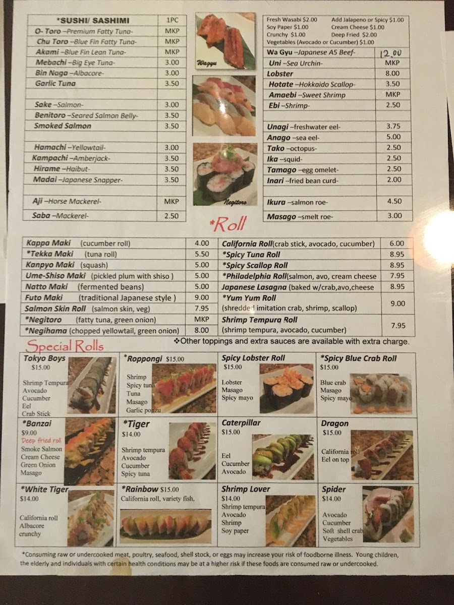 This menu offers a range of Japanese cuisine featuring various traditional and contemporary dishes. It is organized into distinct categories for ease of selection, including rolls, special rolls, and donburi bowls along with noodles. The rolls section includes options such as the Negihama (Yellow Tail and Green Onion) and Tuna Roll. Special rolls feature combinations like the Dragon Roll, which is a California roll topped with eel, and the Tokyo Boys Roll, containing shrimp tempura, eel, avocado, and crab.